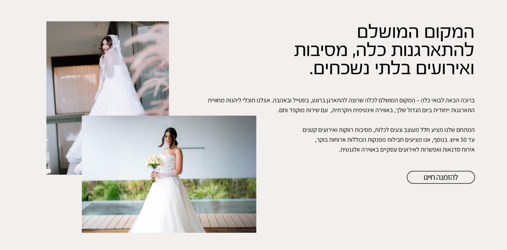 מחפשים מקום לאירוע חברה ייחודי באווירה בוטיקית? בואי כלה מציע מתחם מעוצב ומזמין לאירועים עסקיים קטנים עד 50 איש. המקום משלב אלגנטיות, פרטיות ושירות מוקפד, ומתאים למפגשים עסקיים, ימי גיבוש, סדנאות צוות ואירועי השקה. ניתן לשלב כיבוד מפנק, סדנאות חווייתיות ואווירה ייחודית שתהפוך את האירוע שלכם למרשים ובלתי נשכח.